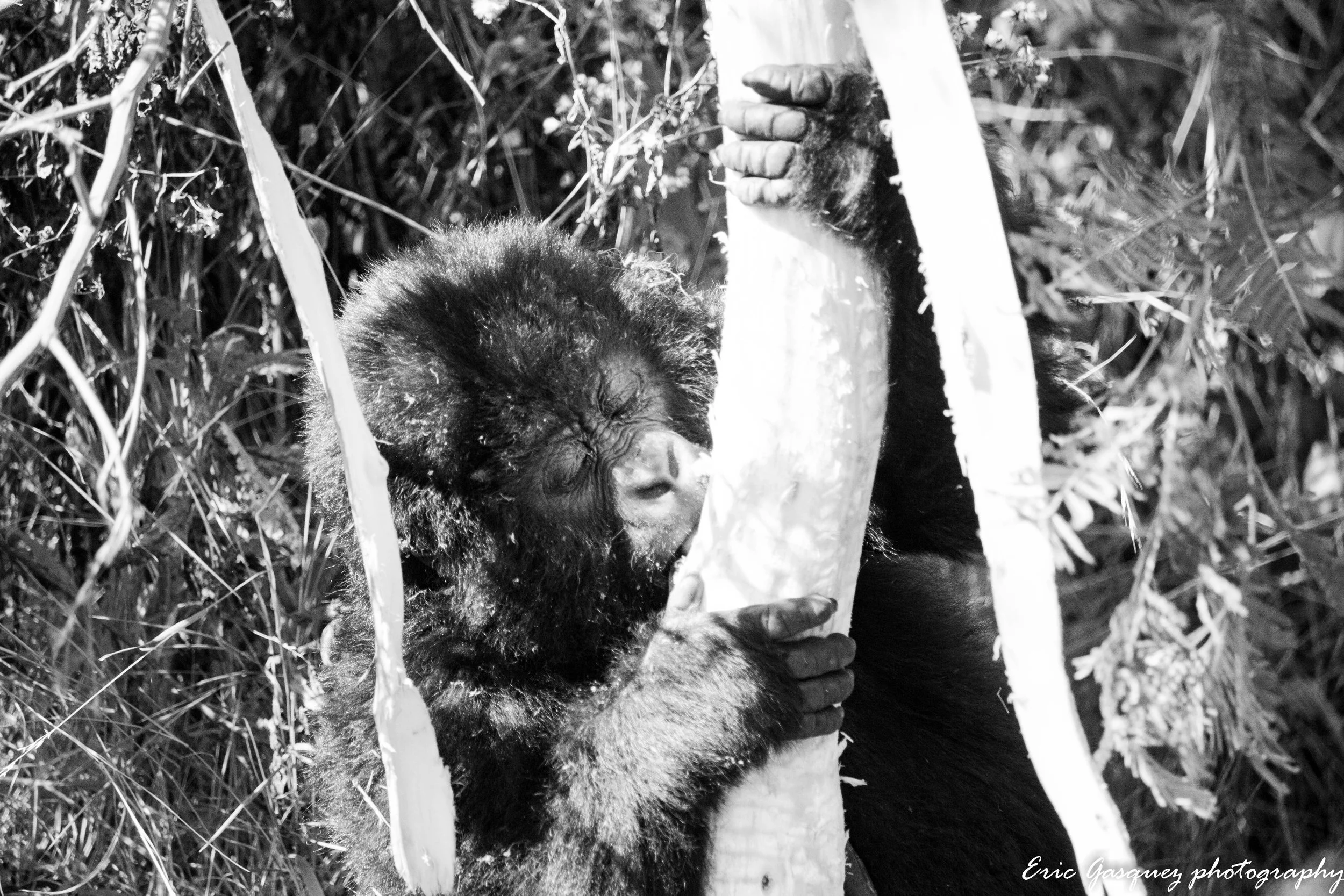 Au moment du regroupement avant de redescendre la montagne, j’aperçois cette machette plantée dans une fine souche, celle d’un des cinq trackers qui a terminé sa besogne de pistage. Cet objet aura marqué l’histoire de cette partie de l’Afrique. Pour les gorilles, elle aura sonné le glas de leur existence pendant des décennies. Elle les protège aujourd’hui. Réhabilitation d’un outil. Trônant ainsi, il me met pourtant mal à l’aise. Alors, j’espère revoir un jour le dos argenté.