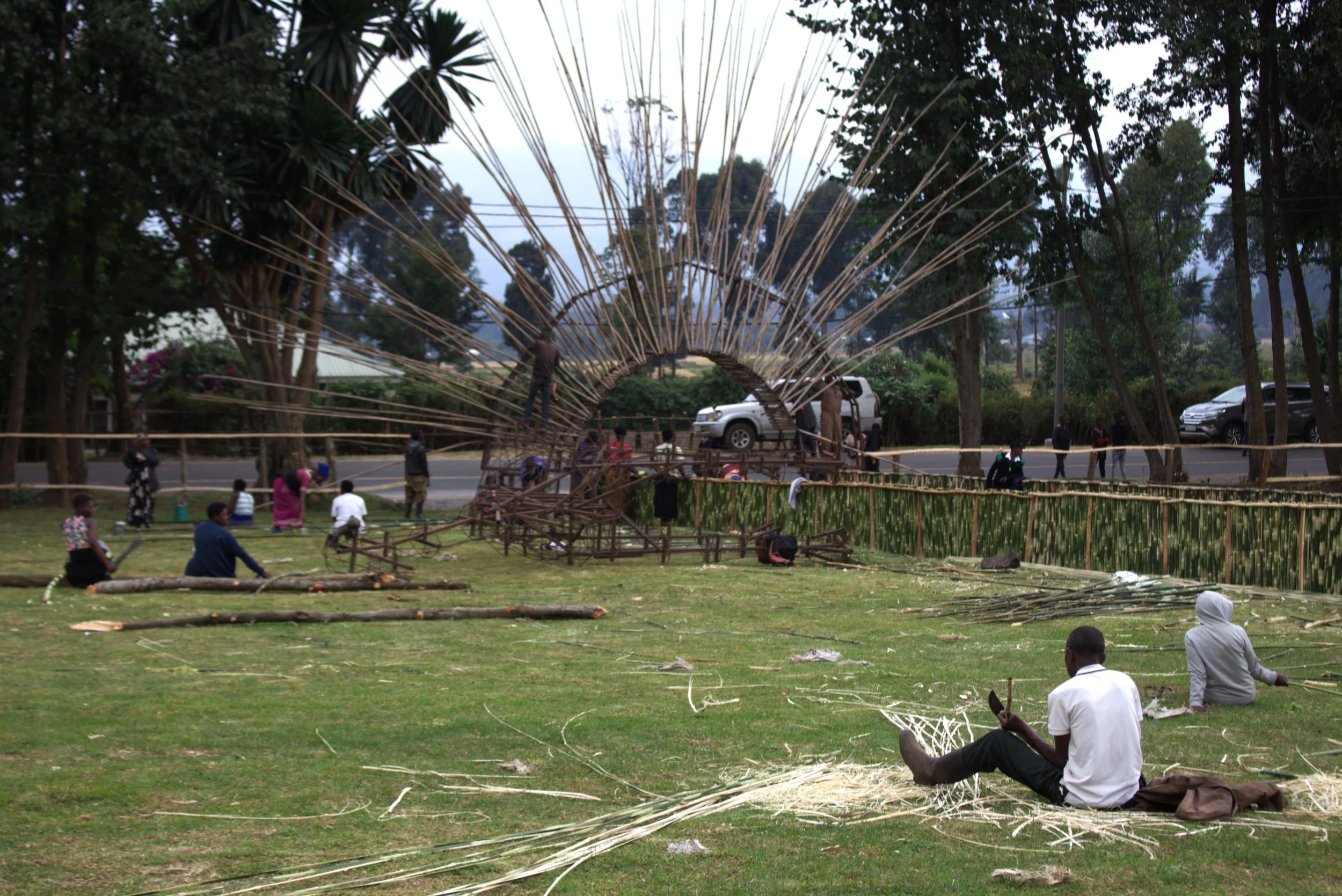 La population s’affère à tisser des pièces en bambous qui serviront à construire ce monumental projet architectural.