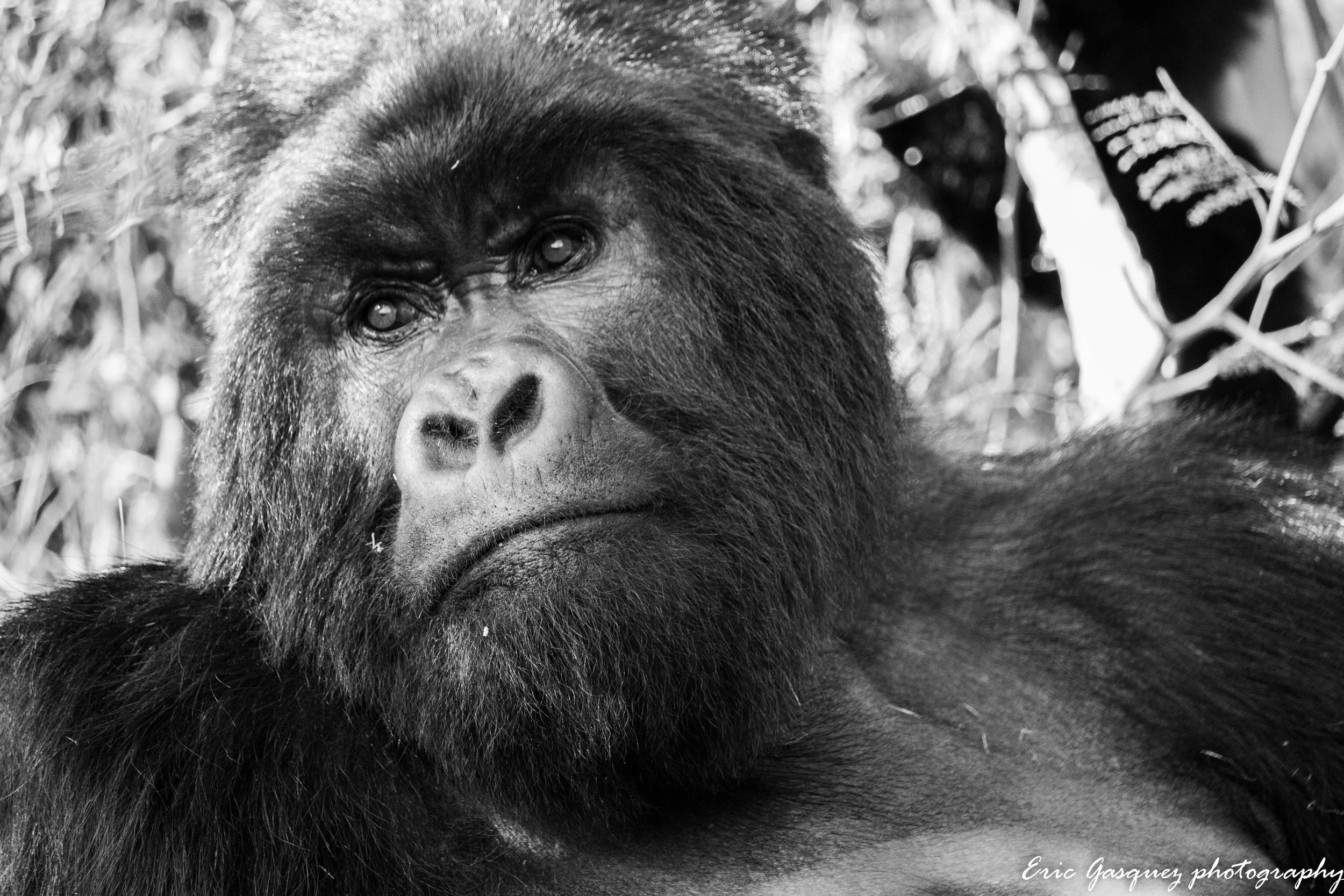 Chez les gorilles, le regard est un langage. Comme chez nous. Mais il nous arrive de cacher le nôtre pour empêcher nos paroles de le trahir. Mark, mal dominant, veille ici sur son groupe, d’un regard paternel.