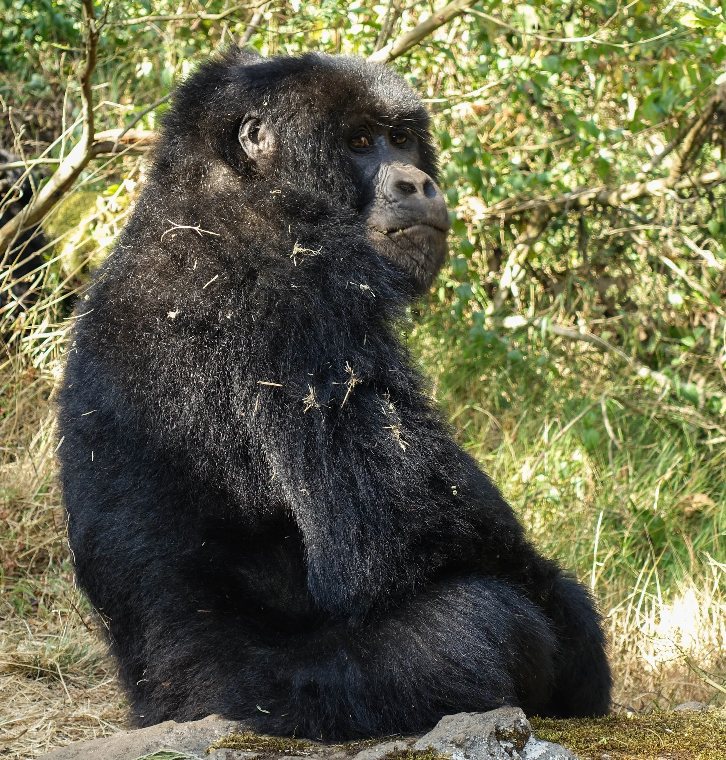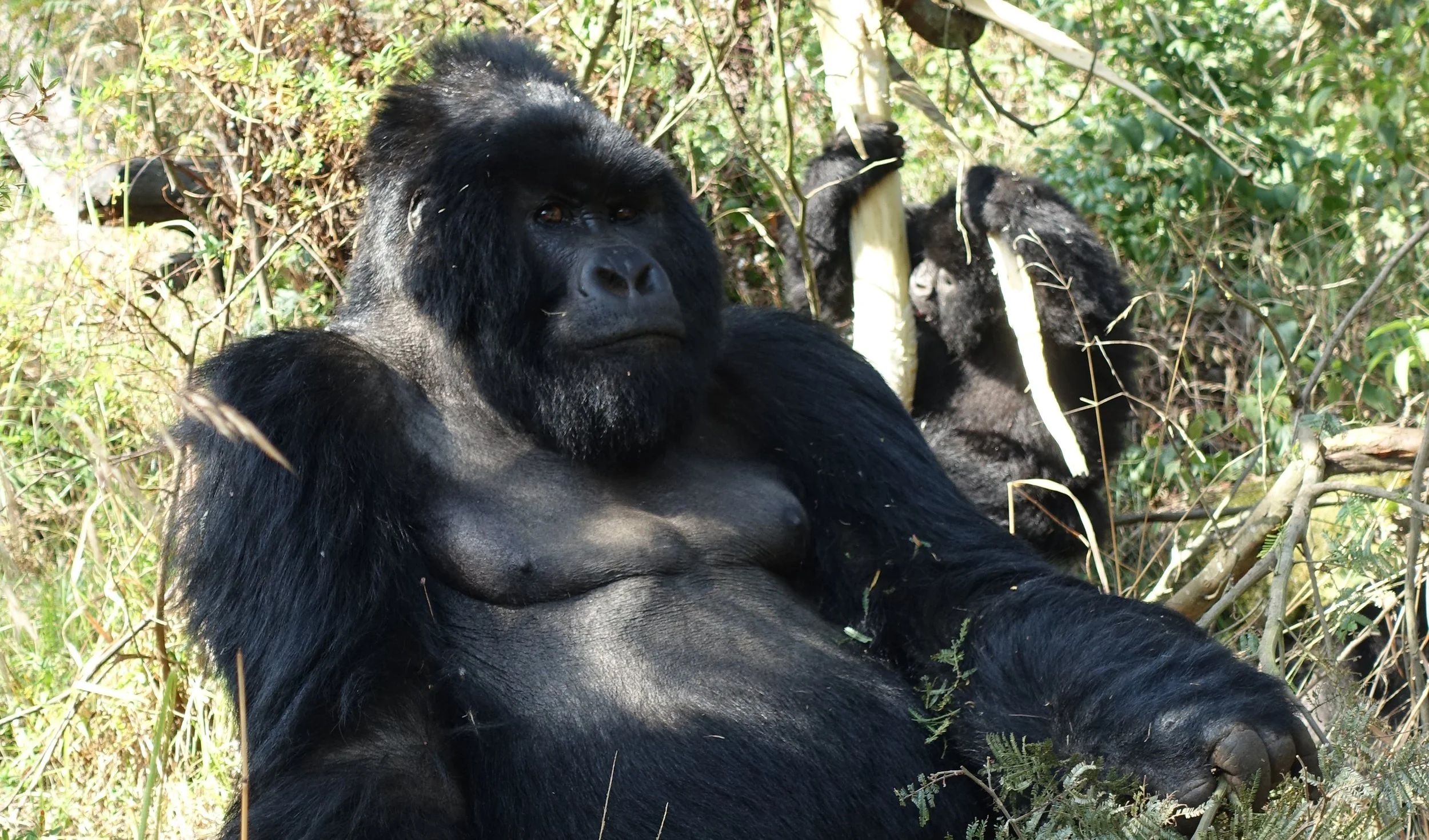 Ouganda - Le Parc national des gorilles de Mgahinga comprend trois groupes de gorilles des montagnes. Un seul a été habitué à la présence humaine, le groupe Nyakagezi. Cette famille comprend trois dos argentés, deux dos noir, deux femelles adultes, deux juvéniles et deux bébés. Il est rare de voir autant de dos argentés dans un groupe de gorilles de montagne. Mais il n’y a qu’un seul mâle dominant. C’est vers l’âge de 15 ans, la maturité sexuelle atteinte, qu’un dos noir devient un dos argenté et qu’il peut prétendre au contrôle de son groupe.