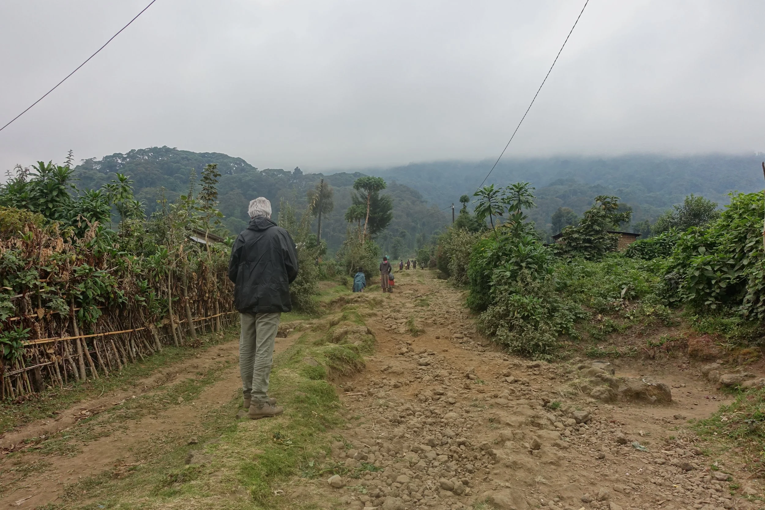 La route prise autrefois par Dian Fossey pour se rendre à son camp de recherche. Une long chemin caillouteux duquel on aperçoit cette brume mystique recouvrant Karisoke. Le Karisoke Research Center était niché dans une zone située entre le Visoke (au nord) et le mont Karisimbi (au sud).