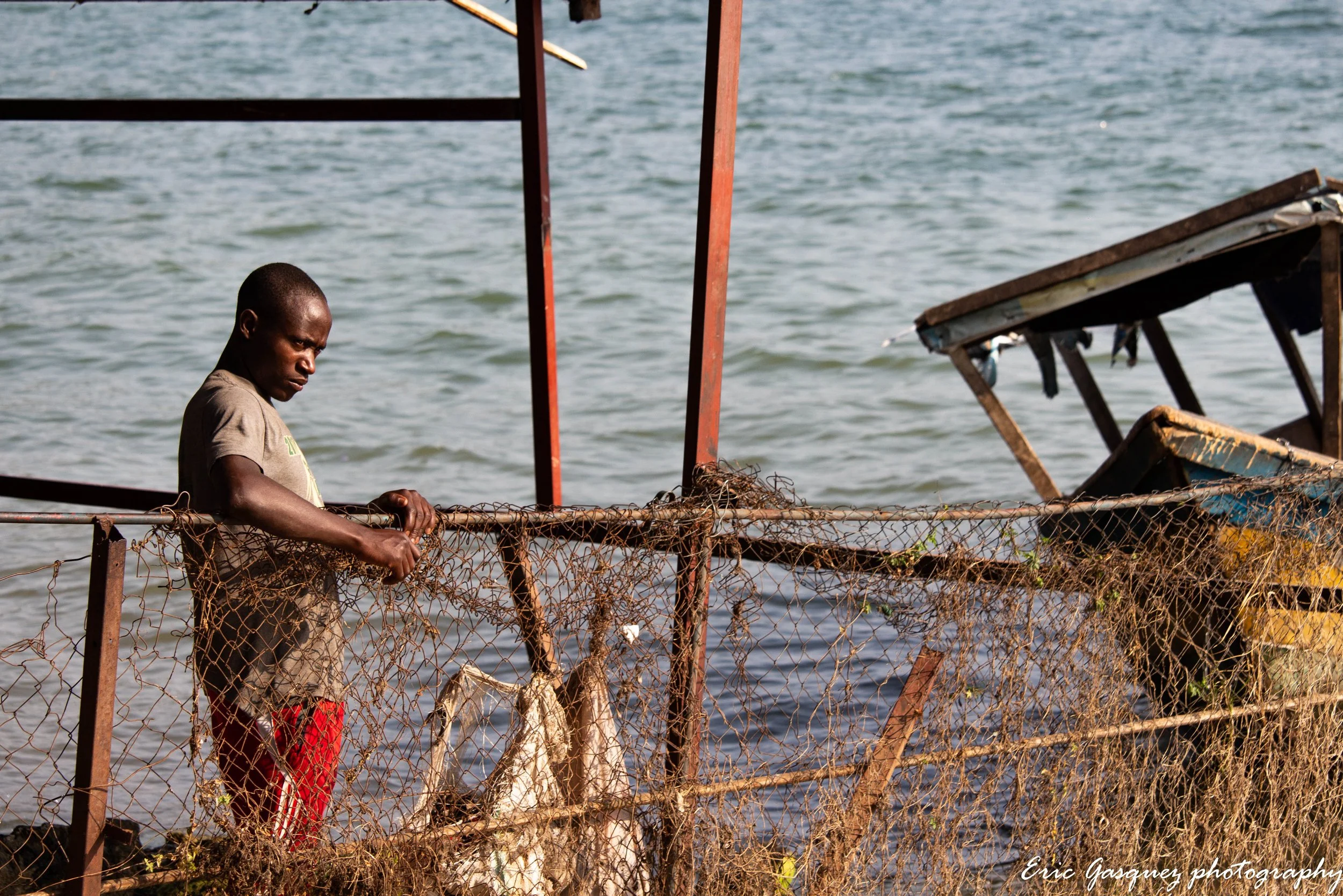 Le lac Kivu, étendu et insondable, présente ses rives comme un miroir aux multiples facettes. Ses eaux calmes semblent dissimuler les douleurs du passé, le poids de ce qu’elles ont absorbé. La flore qui borde le lac, des nénuphars délicats aux herbes basses, crée une illusion de paix. Mais tout autour de ce miroir liquide, il y a le souffle des vivants, et la terre, qui rappelle l’impossible réconciliation. Chaque vague semble porter avec elle un écho du passé, chaque reflet dans l’eau est une image d’un monde qui ne pourra jamais tout effacer.
