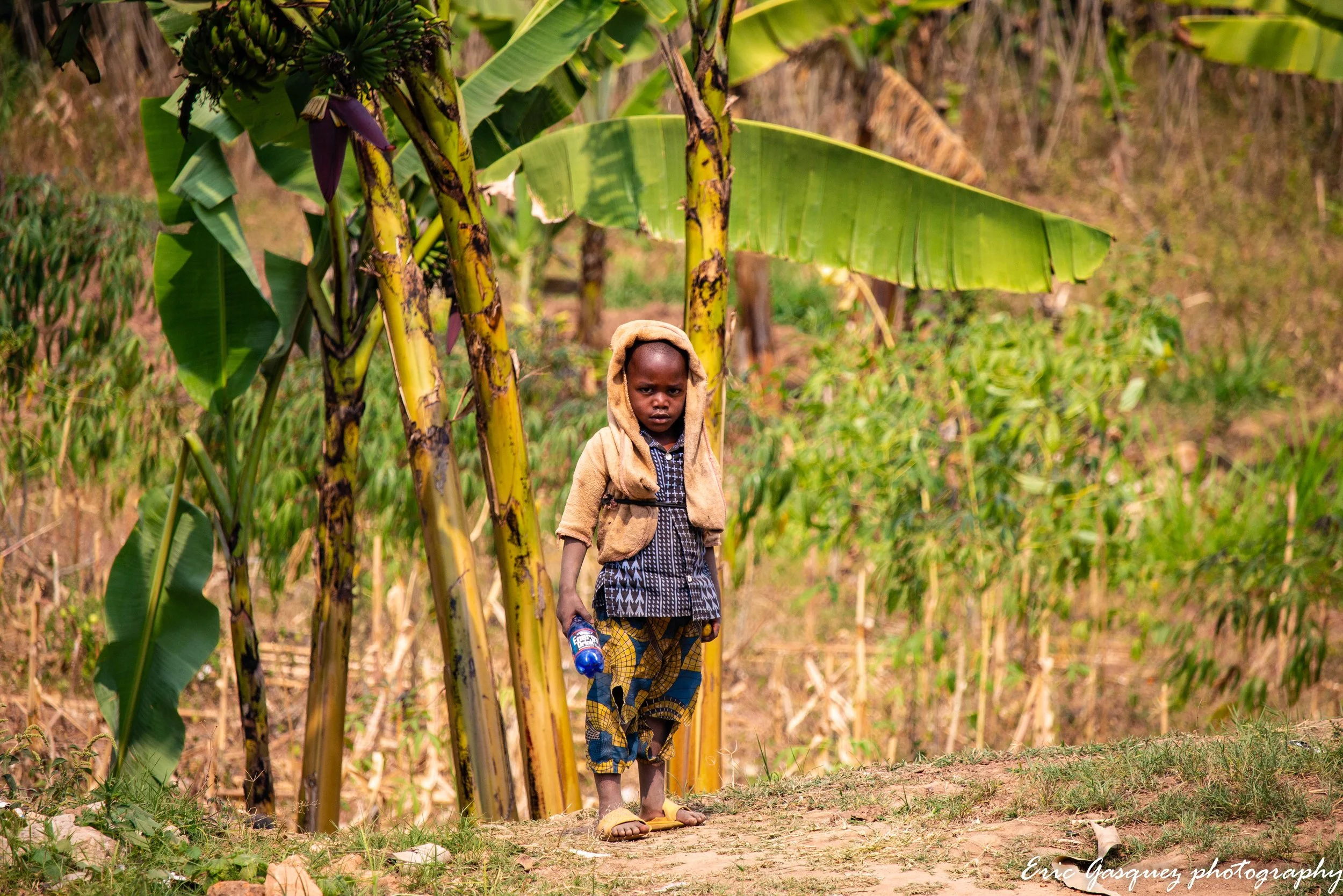 Le Rwanda, avec sa faune et sa flore si présentes, nous offre une réflexion douloureuse : la beauté n’est ni pure, ni innocente. Elle est traversée par les fractures, les cicatrices invisibles que la guerre laisse derrière elle. Les animaux, les arbres, les montagnes, et même les eaux, semblent détenir une sagesse que l’humain perd parfois de vue, celle qui rappelle que la nature, elle, vit et meurt sans en comprendre la raison. Si le Rwanda nous parle à travers sa beauté, il nous parle aussi, à chaque souffle du vent, de la fragile illusion de la paix, de l’éternelle absurdité du monde. Et là, une enfant qui fait une pause presque mystique pendant que ses chèvres broutent hors champ.