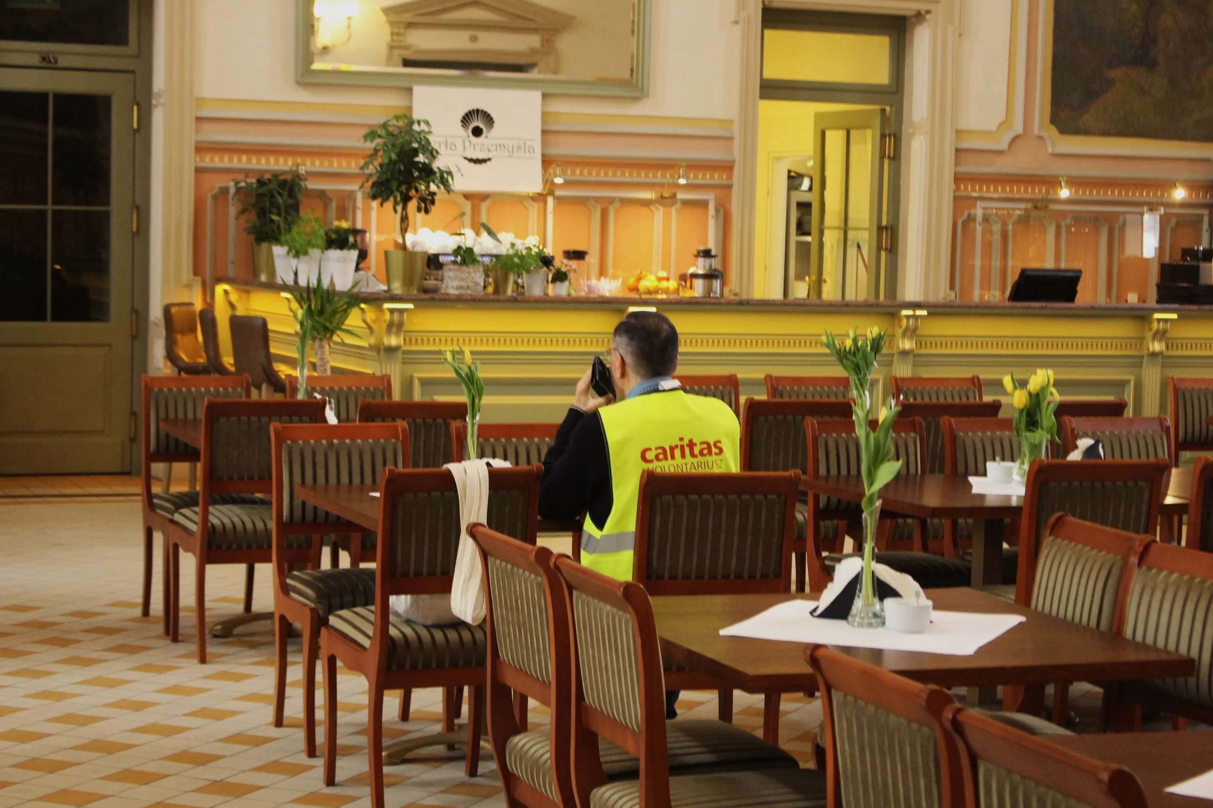 Pause d’un volontaire de la Caritas très présente à la frontière. Dans l’espace cossu de cette brasserie de la gare de Przemysl, ce cadre coordonne sa mission d’aide.