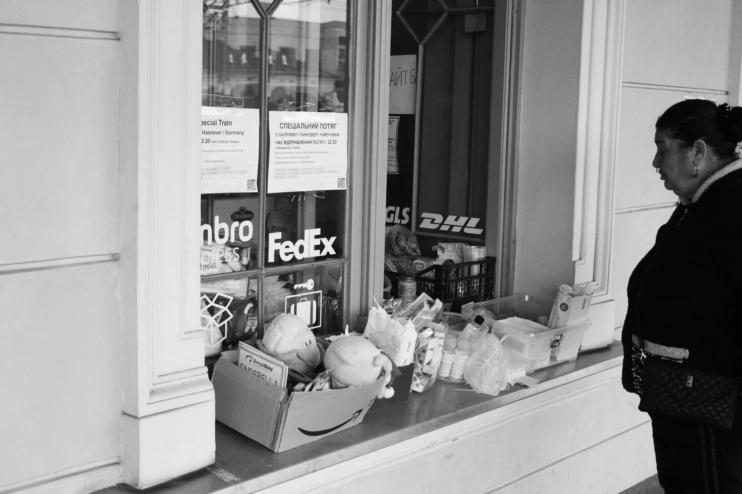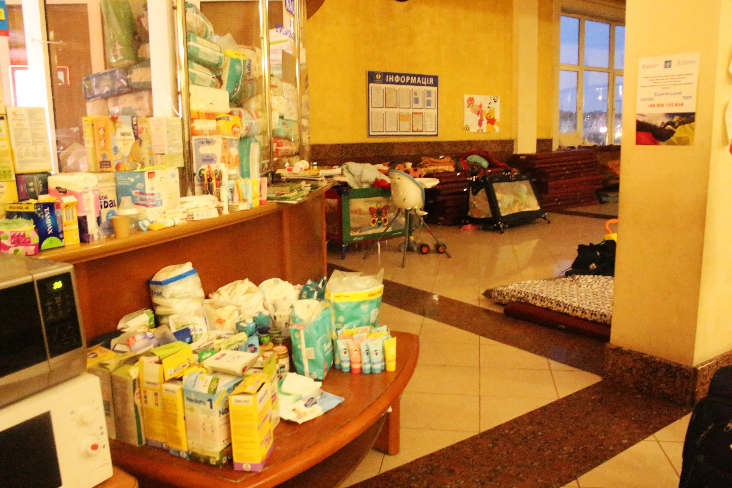 Gare d’Lviv. Les produits de première nécessité à destination des femmes et des enfants principalement.