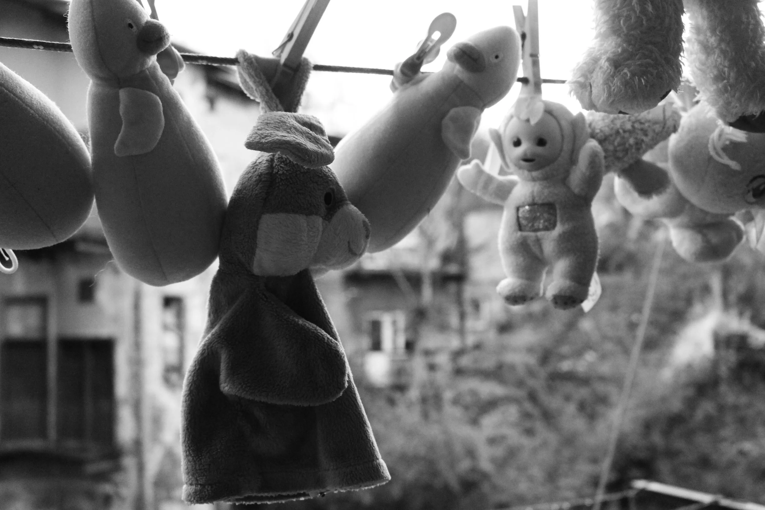 Une habitante de Przemysl, volontaire, étend ses peluches soigneusement lavées pour les apporter à la gare.