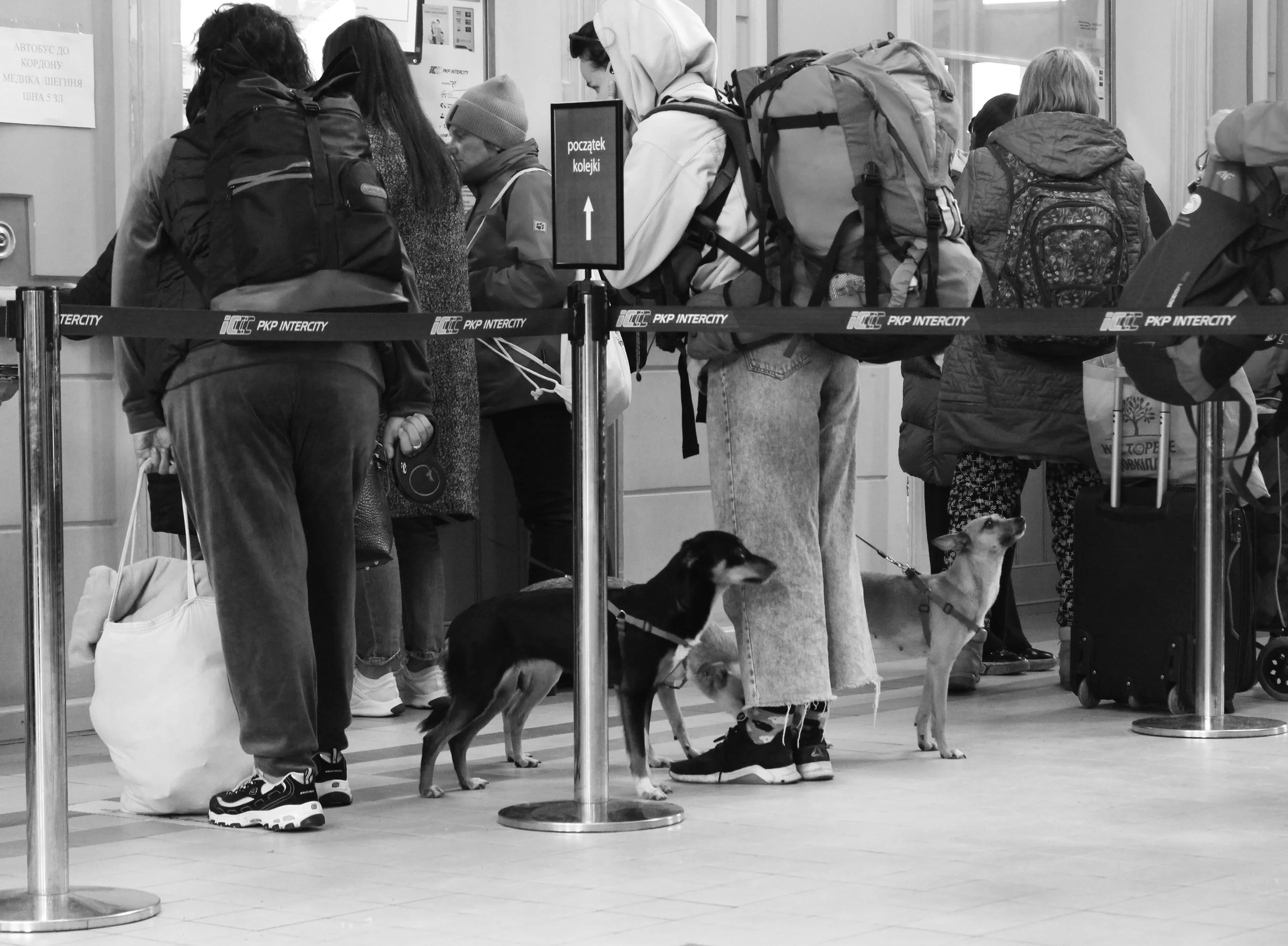 Dans l’attente d’un billet pour Varsovie, ces deux chiens jettent des regards effarés sur la nouvelle vie qui les attend.