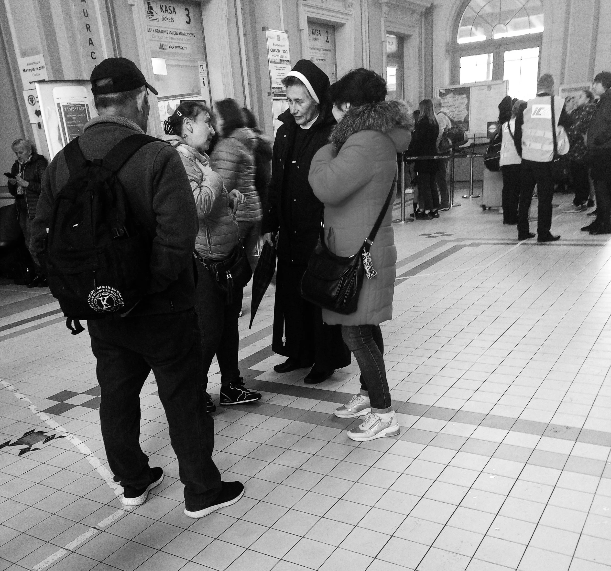 Gare de Przemyls, Pologne. Une sœur s’enquiert du moral des réfugiés. Un soutien moral primordial pour un peuple très pratiquant.